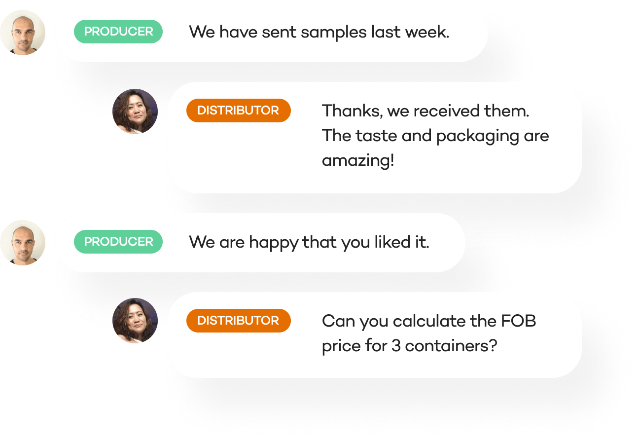 Find something you like? Want to make an enquiry or ask some more questions? Start a conversation with the supplier or producer immediately, right on our platform.